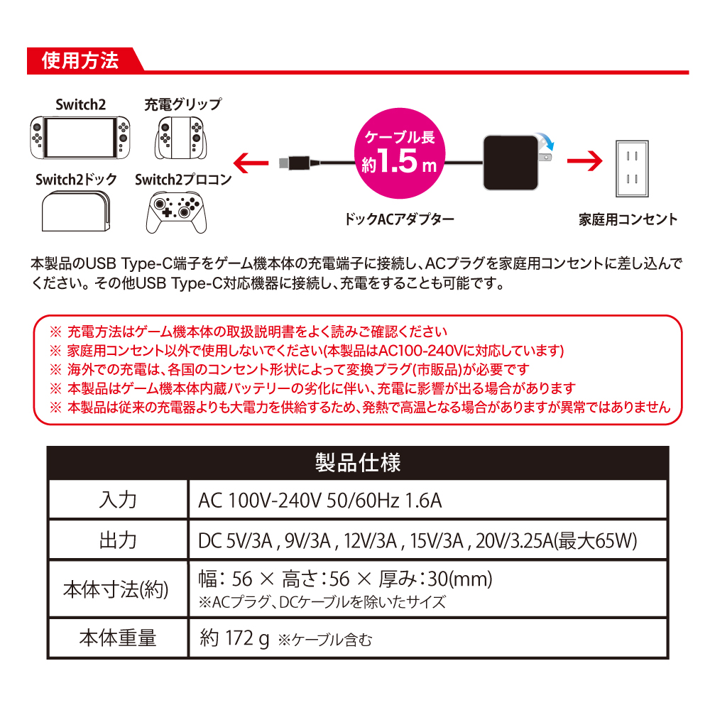 「Switch2用 ドックACアダプター」ですが、最大出力が65Wとなっております。