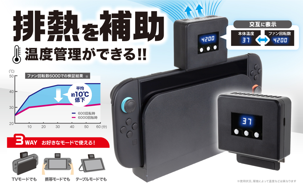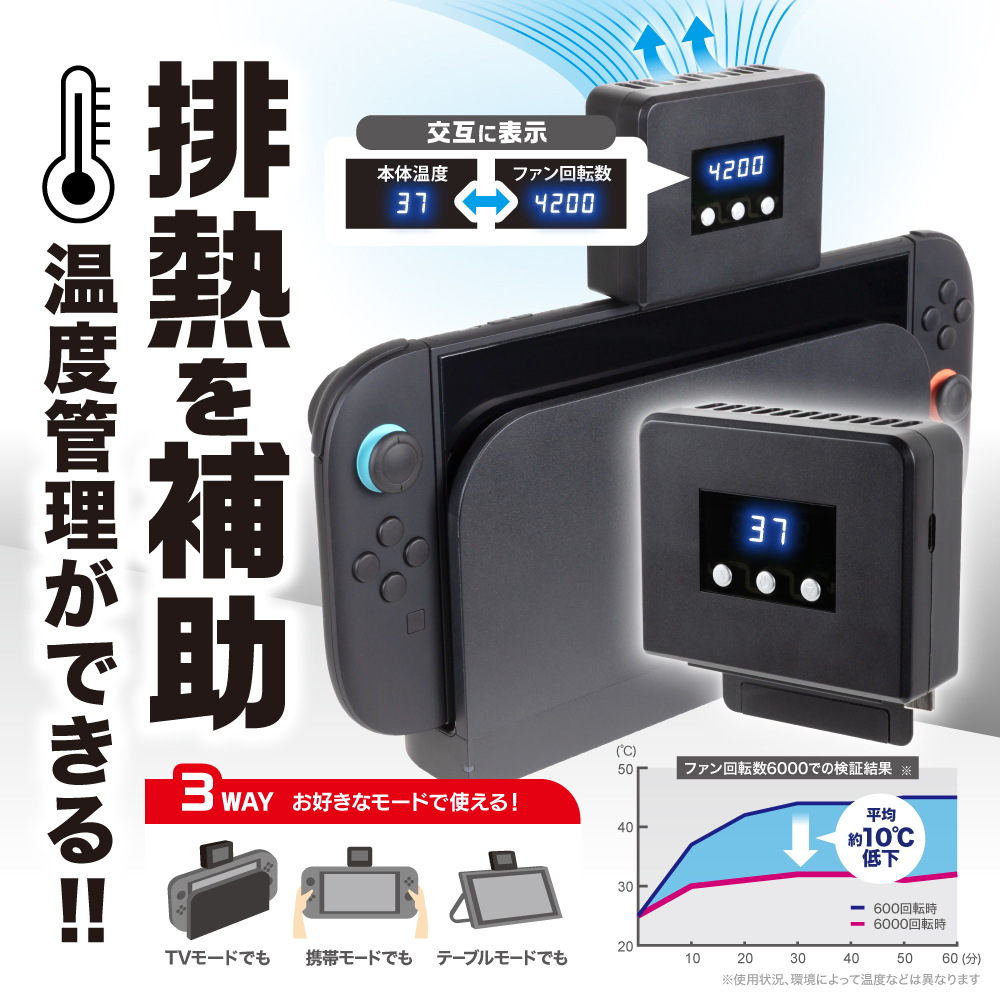 ※ 本製品はSwitch2本体の電源がONの状態でのみ使用できます。本体がスリープモードや電源がOFFになると、自動的にファンが停止します。Switch2起動時、自動でファンはONになりませんのでご注意ください。