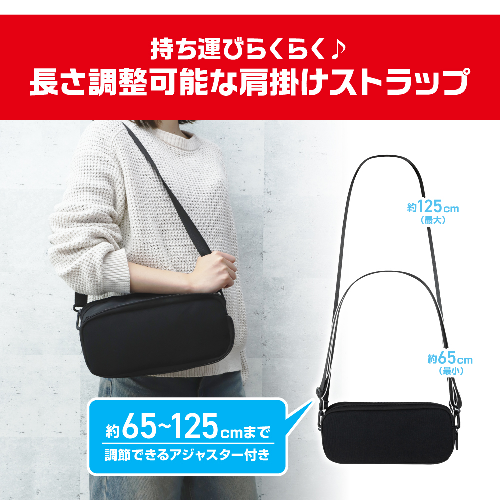 取り外し可能な長さ約65~125cmまで拡張可能な肩紐ストラップ付き。