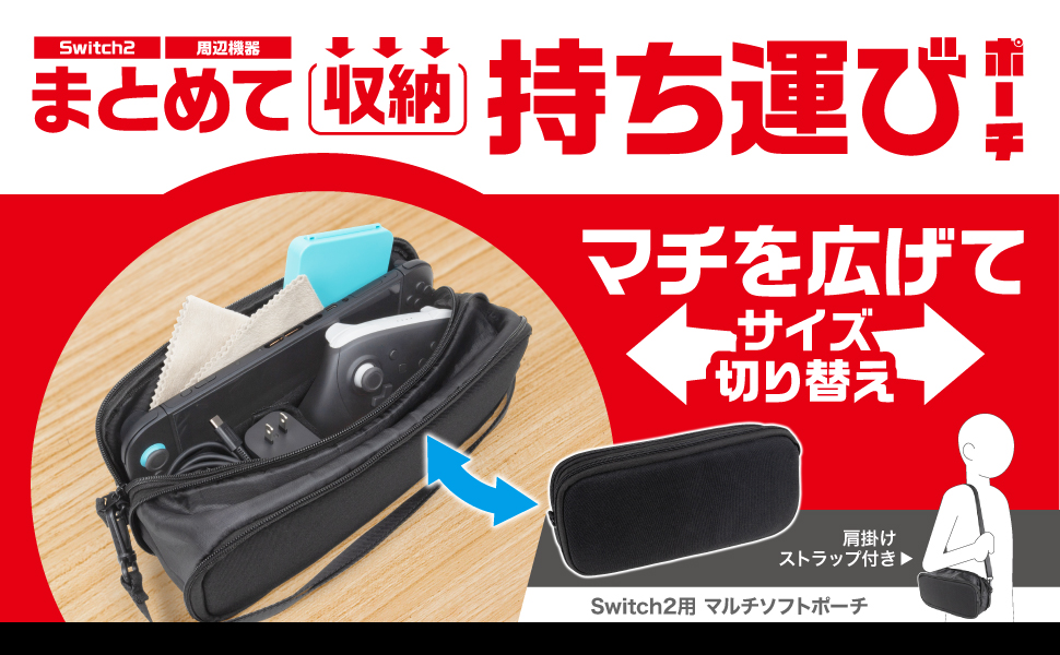 そのまま使用することでSwitch2を1台収納しコンパクトに持ち運ぶソフトポーチになります。