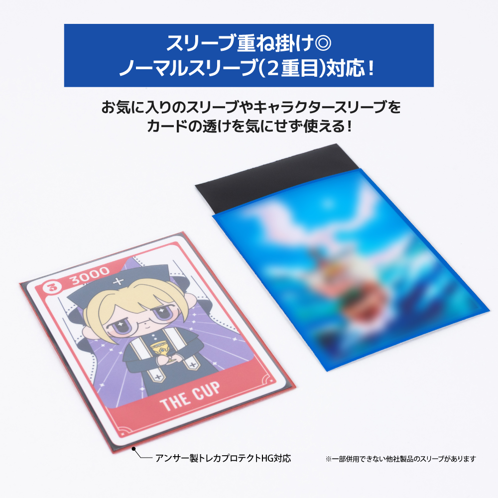 カード背面が透けないように背面はブラックを採用し、白や黄色など薄い色のカラースリーブを重ねてもカードの柄が透けるのを防止します。また、裏透けを防止することで、大会でのマーカー・ペナルティ対策にご使用いただけます。