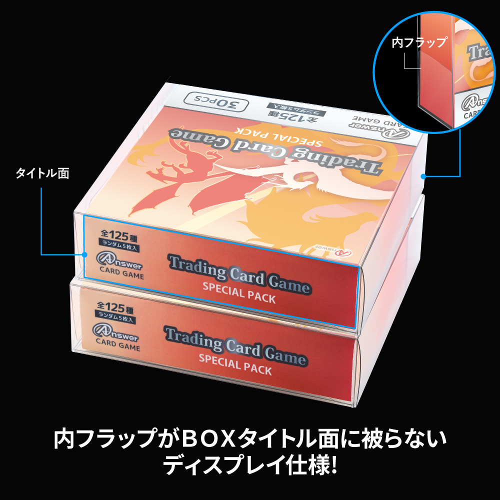 設計から製造すべてを国内でおこない、アンサー独自の仕様として、トレカBOXのタイトル部分に箱の内フラップが重ならないように配慮した、コレクター目線の組み立て構造を実現。組み立てもテープやのりを使わないかんたん組み立てです。